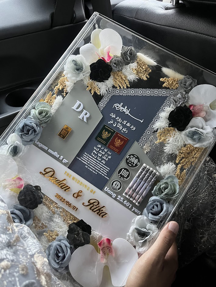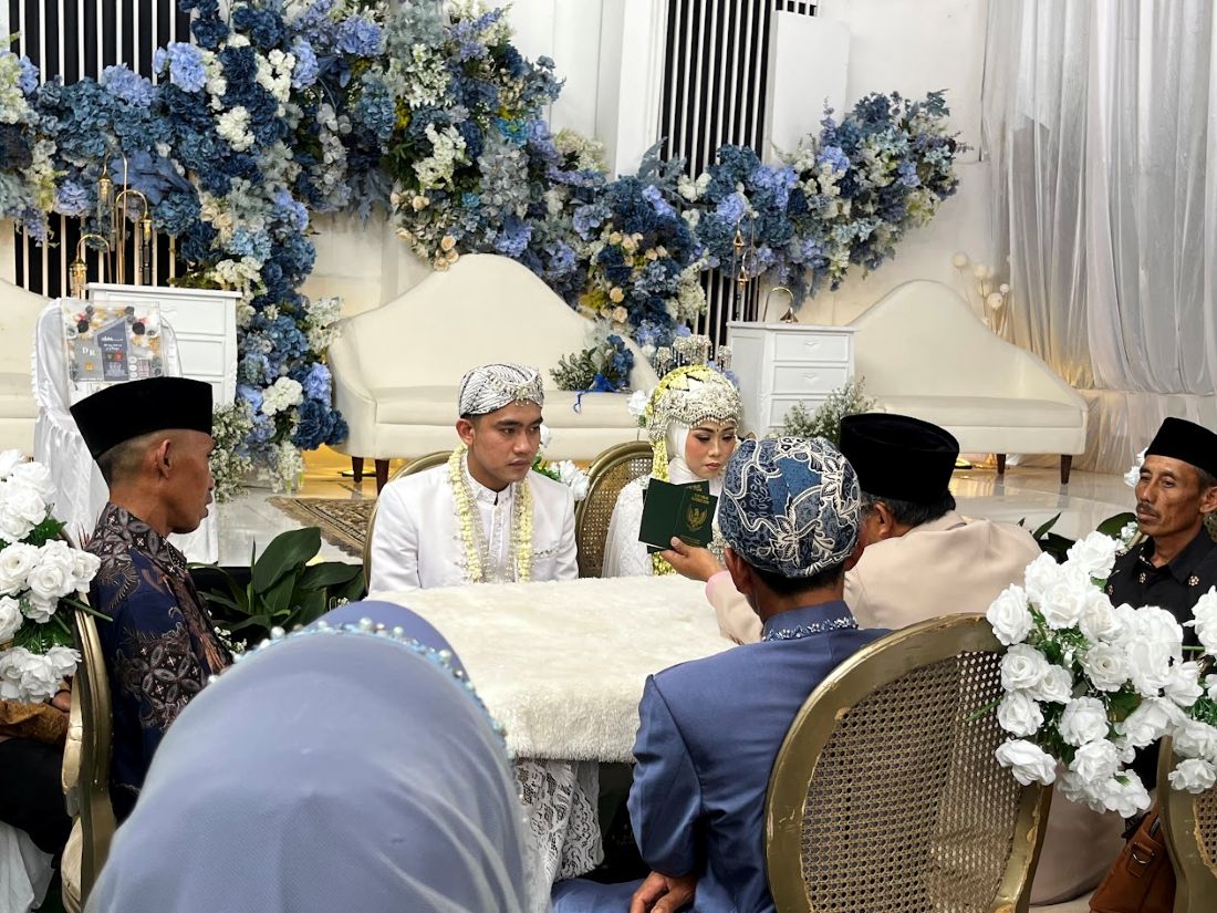 パフォーマンスが終わってすぐ、新郎新婦は宗教指導者の立会いのもとで結婚契約を結ぶ儀式を行います。新婦の父が婚姻を承諾する旨を表明し、新郎が受け入れ、婚姻証明書(Buku Nikah)に署名をすることで、宗教的・法的に正式な結婚が成立します。この時、新郎から新婦へ金や宝石など価値のあるものが結婚贈与として送られます。粛々とした儀式の中で、結婚という大きな節目を迎えたことをかみしめるように涙していたダダンさんの姿がとても印象的でした。
